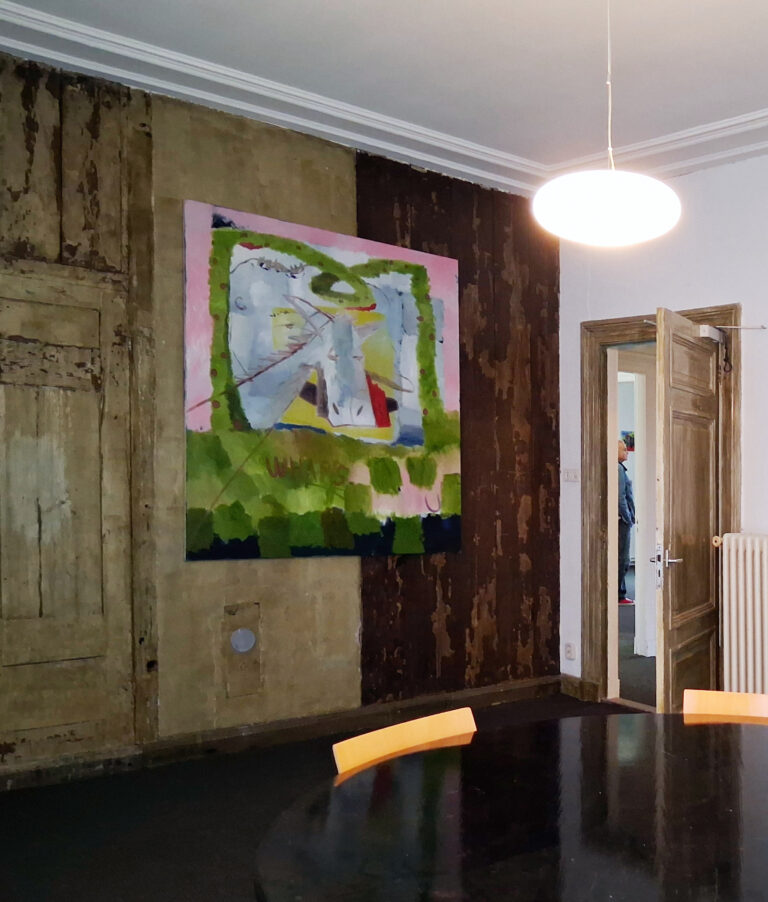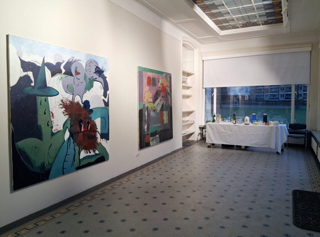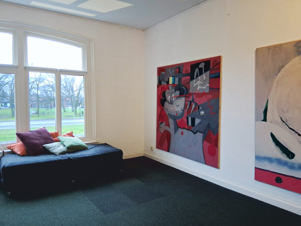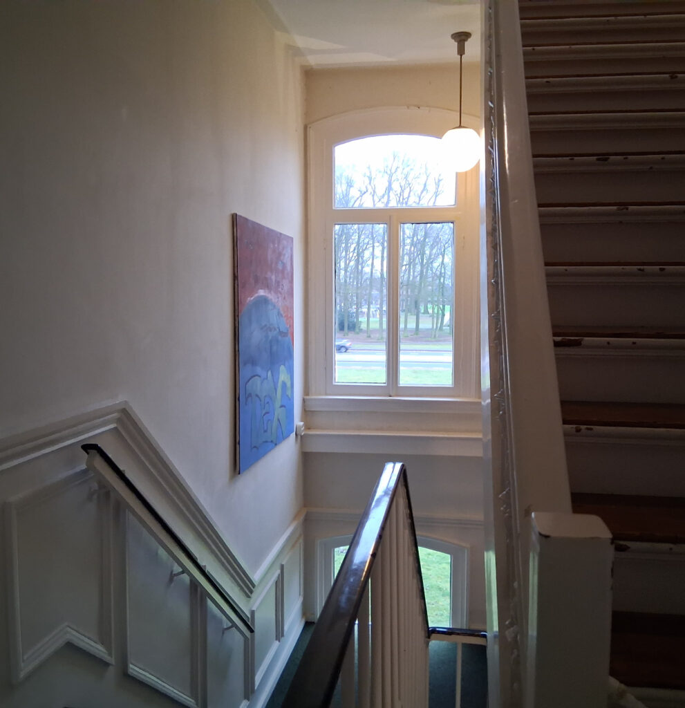 Gleich auf zwei Etagen der beeindruckenden, überaus einladenden Villa am Stadtrand Enschedes sind Pimpernellis Bilder ausgestellt worden und luden zum Betrachten ein. Der Niederländer Paul Silder – selbst malender Künstler und Gründer des Enscheder Kunstraums „Villa de Bank“ – hat es sich zur Aufgabe gemacht, junge Künstlerinnen und Künstler zu fördern – durch das Möglichmachen von Ausstellungen und den Verkauf der Kunstwerke. Paul pflegt seit Jahren gute Kontakte in die Düsseldorfer Kunstszene und ist regelmäßiger Besucher sowohl der Rundgänge In der Kunstakademie als auch der Verkaufsausstellung „Die Grosse“ im Kunstpalast. Auf diesem Weg sind ihm erste Bilder von Max aufgefallen. Bilder, die er gerne in „het witte huis“ ausstellen würde. Ramon Quenders und Steffen Mischke, die selbst ihre Ausstellung bei Paul in Enschede hatten, schlugen die Brücke zur Max Retrospektive Gruppe, sodass die Ausstellung „Little van Gogh“ – passender Weise in den Niederlanden – möglich wurde. Vielen Dank für die internationale Zusammenarbeit!
